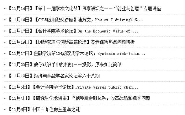 中央财经大学每周都会有精彩纷呈的讲座和论坛,同学们可以在课余时间去参加,聆听业界专家与实践者的分享,充分感受财大特有的校园文化和氛围。以下是近期的部分讲座信息和照片。