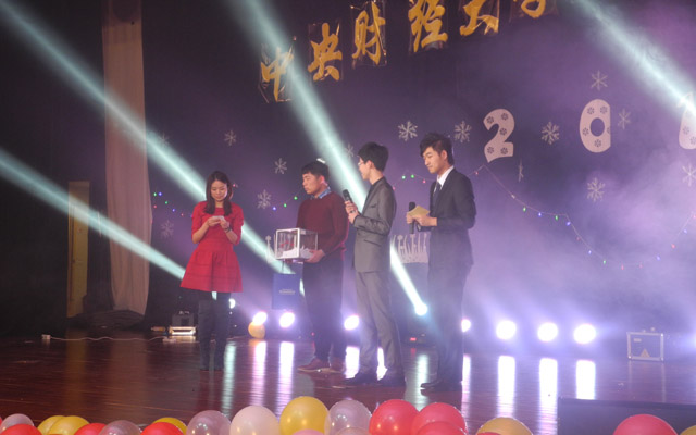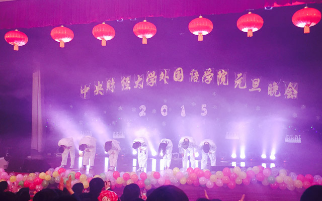 2014年12月29日晚,晚会在中央财经大学学术会堂拉开帷幕。外国语学院副院长师文杰老师,学院办公室主任李名义老师以及SQA AD中心的多位教师都前来观看了此次演出。英国哈德斯菲尔德大学和提赛德大学的老师们也前来观看晚会。